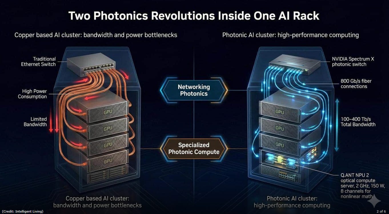 Texnoloji tərəfdə isə elektron çiplər tədricən photonic (fotonik) çiplərlə əvəz olunmağa başlayacaq. Photonic çiplər elektron çiplərlə müqayisədə daha yüksək sürət, aşağı enerji sərfi və daha az istilik problemi yaratdığından bu sahəyə tələbat sürətlə artacaq. Hazırda bu istiqamətdə Intel (Silicon Photonics) və Broadcom (data center üçün optik şəbəkə və photonic modullar) əsas aparıcı oyunçular hesab olunur.