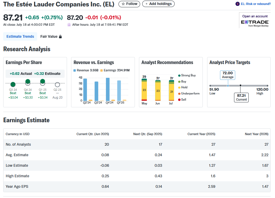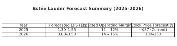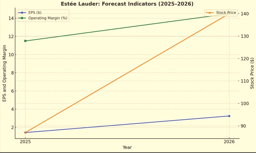 Mənim fikirmcə Estée Lauder-in bu günkü qiyməti, uzunmüddətli perspektivdə 70% ucuz qiymətləndirmə deməkdir. Əgər rəhbərlik “Beauty Reimagined” planını uğurla davam etdirə bilsə, bu brend 2026-cı ildə təkcə maliyyə göstəriciləri ilə deyil, bazar payı və texnoloji liderliklə də fərqlənəcək. Hazırda Estée Lauder-in səhmi təxminən 87 dollar civarındadır. Əgər proqnozlaşdırılan qazanc və marjalar reallaşarsa, analitiklərin fikrincə səhm qiyməti 2025-ci ilin sonuna qədər 120 dollara , 2026-cı 1-ci rübünə qədər isə 130–150 dollara qədər yüksələ bilər.