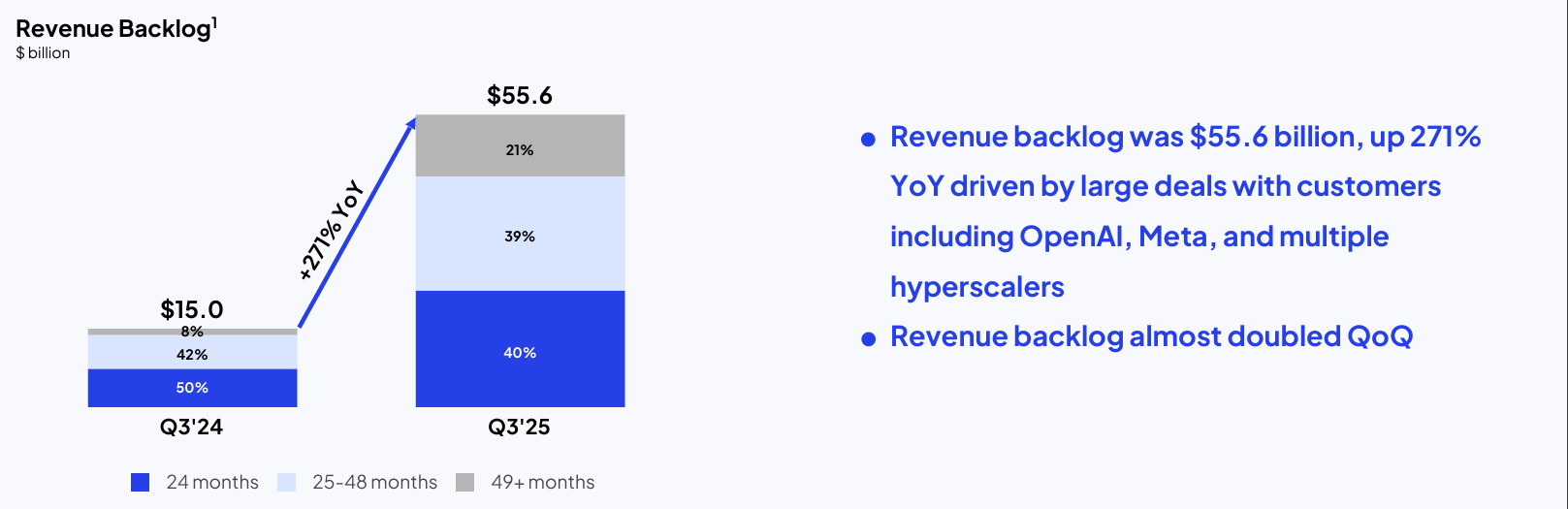 Şirkətin son 12 ayda 2.71 milyard dollar gəlir əldə etməsi və bunun əvvəlki illə müqayisədə 420% artım göstərməsi təsadüfi deyil. Bu, bazarda real və sürətli bir struktur dəyişiklik baş verdiyini göstərir. Q3 2025-də açıqlanan 1.4 milyard dollarlıq gəlir və 134%-lik illik artım artıq bir faktdır. Daha da diqqətçəkəni isə 55.6 milyard dollarlıq backlog – yəni gələcək illər üçün artıq müqaviləsi bağlanmış sifariş portfelidir. Üstəlik, şirkətin 2.9 GW müqavilələşdirilmiş gücü və təxminən 590 MW aktiv işlək tutumu var. Bu rəqəmlər AI infrastruktur yarışında ciddi mövqe deməkdir.