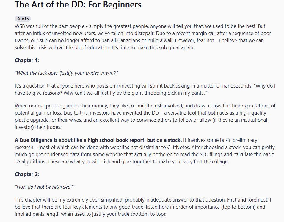 Araşdırmalar göstərir ki, WSB-də yayılan Due Diligence (DD) yazılarının təxminən 88–95 %-i "al" tövsiyəsidir və bu təkliflər adətən yüksək (short interest) və həcm dalğalanması (volatile) olan səhmlərə fokusludur. Due Diligence (DD) termini maliyyə və investisiya dünyasında çox istifadə olunur və əsasən “ətraflı yoxlama”, “araşdırma” və ya “dəyərləndirmə prosesi” deməkdir. Reddit-dəki DD-lər həmişə peşəkar olmur. Bəzən emosional, bəzən isə qəsdən manipulyativ olur. Yəni oxuyanda tənqidi düşünmək və öz analizini aparmaq vacibdir. DD oxuyarkən yazanın profilinə nəzər salmaq, onun real təcrübəli insan olduğunu yoxlamaq lazımdır. Yazının mənbələrlə bağlantısını, balans hesabatını, SEC (Securities and Exchange Commission (SEC) – yəni Qiymətli Kağızlar və Birja Komissiyası - https://www.sec.gov/submit-filings) sənədlərini yoxlamaq sizi risklərdən qoruya bilər.