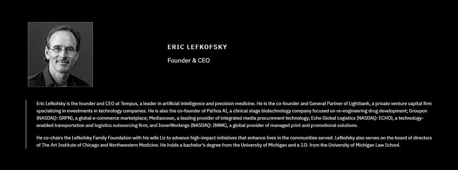 2015-ci ildə Eric Lefkofsky həyat yoldaşının döş xərçəngi ilə mübarizəsi zamanı bir şeyi dərk etdi: müasir səhiyyə sistemində texnologiyanın rolu çox zəifdir. Tibbi qərarlar hələ də çox zaman ümumi statistikaya və intuisiya əsaslanırdı. Lefkofsky bunu dəyişmək istədi. Və beləliklə Tempus AI doğuldu.