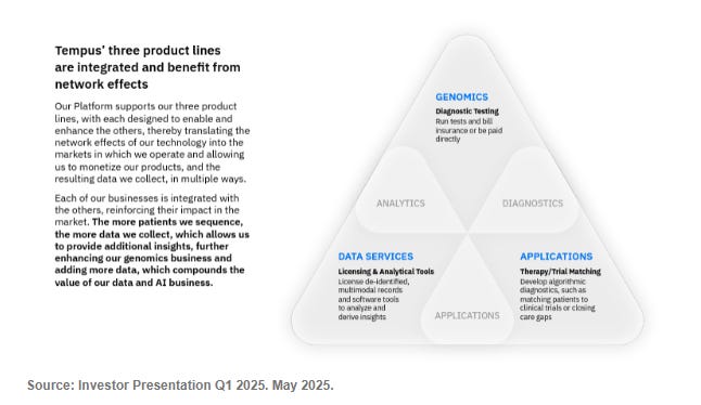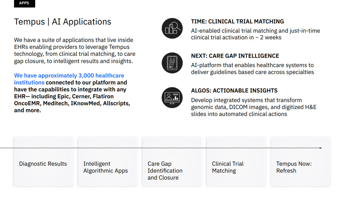 AI Tətbiqləri – Tempus bu məlumatlar üzərində qurulmuş süni intellekt sistemləri yaradır. Məsələn, "Tempus One" agenti və ya xəstələrin klinik sınaqlara uyğunlaşdırılmasını təmin edən "TIME" sistemi kimi alətlər.