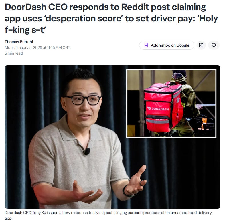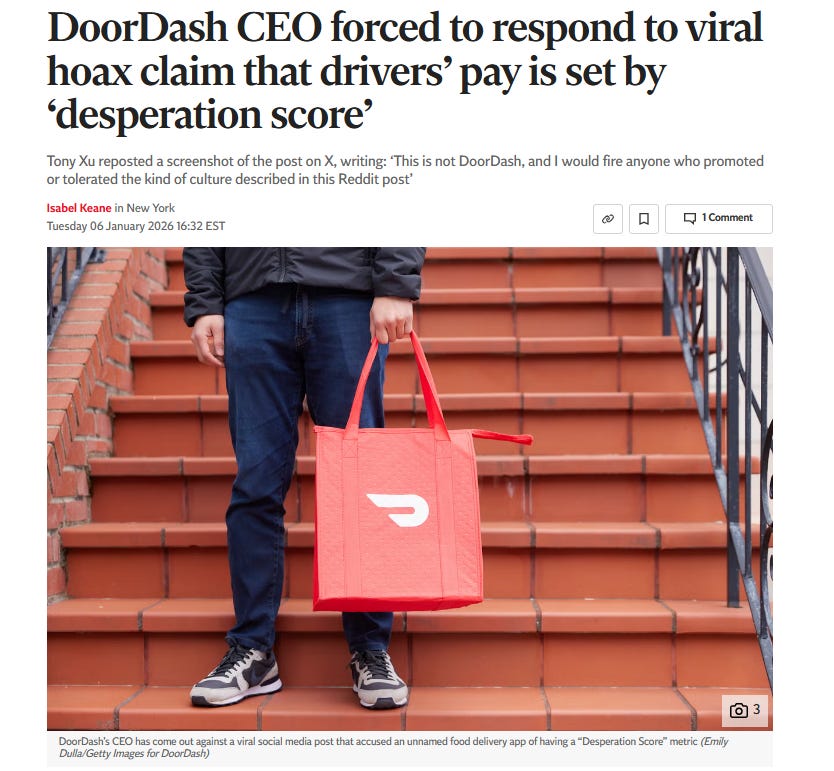 Yemək çatdırılma şirkətlərinin sürücüləri istismar etməsi və qurduqları alqoritmlərin sürücüləri insan kimi deyil, “mülk” (human assets) kimi qiymətləndirməsi, eləcə də onları “Ümidsizlik Balı” (Desperation Score) əsasında kateqoriyalara (çətin vəziyyətdə olan sürücü, pula ehtiyacı olan sürücü, çıxış yolu olmayan sürücü və s.) bölməsi ilə bağlı iddialar DoorDash, Uber, Bolt kimi taksi və çatdırılma şirkətləri üçün ciddi başağrısına çevrilib. Artıq DoorDash-ın CEO-su bu iddialarla bağlı rəsmi təkzib versə də, yüzlərlə sürücü bu iddiaların doğru olduğuna inandıqlarını və sistemin həqiqətən də sürücülərə qarşı amansız davrandığını bildirir.