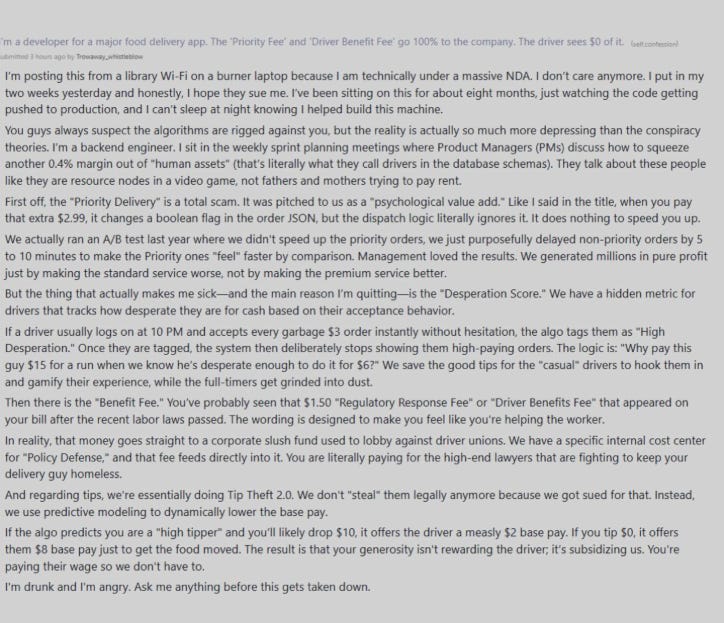 “Mən iri bir yemək çatdırılma tətbiqində developer olmuşam. ‘Prioritet ödəniş’ və ‘Sürücü üçün fayda ödənişi’nin 100%-i şirkətə gedir. Sürücü bundan $0 alır.” (etiraf)